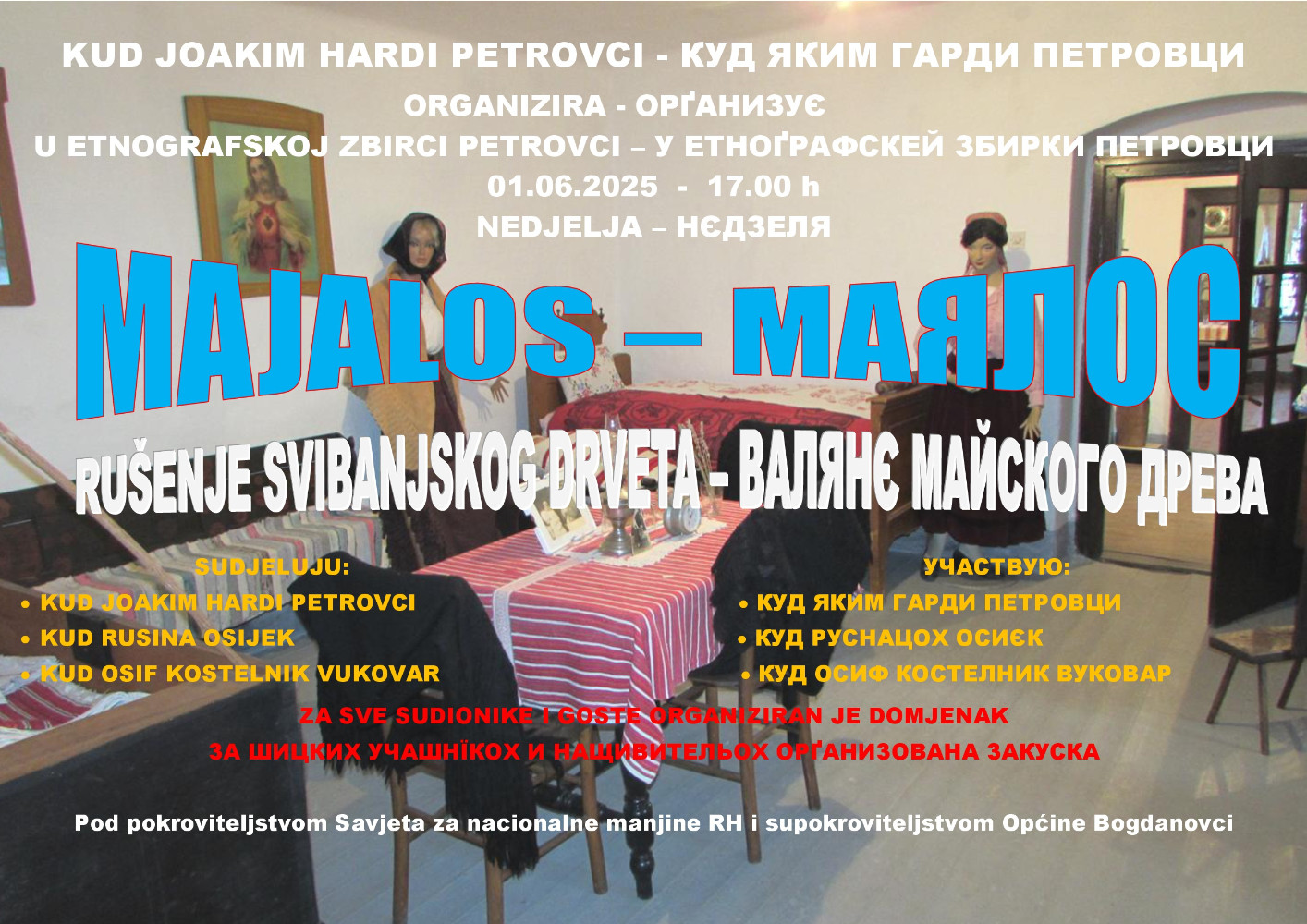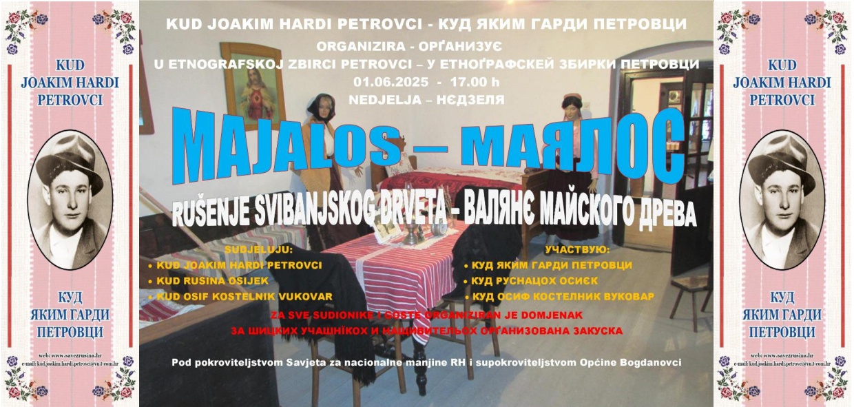 PETROVCI - Pod pokroviteljstvom Savjeta za nacionalne manjine Republike Hrvatske i Saveza Rusina Republike Hrvatske u prigodi 75. Obljetnice KUD Joakim Hardi Petrovci,75. Obljetnice KUD Joakim Govlja Mikluševci, 95. obljetnice od rođenja Vladimira Kostelnika, 95. obljetnice od rođenja Silvestera Erdeljija . U Etnografskoj zbirci održat će se tradicionalna manifestacija "Običaji našeg naroda" Rušenje svibanjskog drveta „Majalos“ 01.06.2025.. godine u nedjelju sa početkom u 17. 00 sati. Organizator je KUD Joakim Hardi Petrovci. U programu će sudjelovatii muška pjevačka skupina KUD Joakim Hardi sa orkestrom, KUD Rusina iz Osijeka i KUD Osif Kostelnik Vukovar